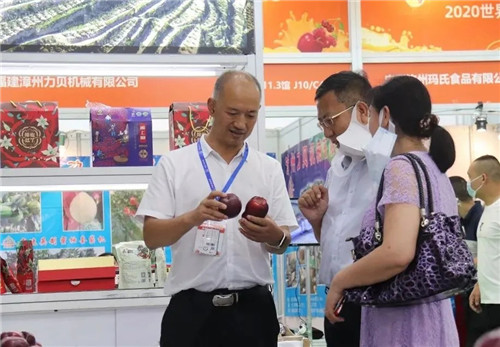 副县长杜兴为广州市商务局会展处副处长、广州商务会展促进服务中心副主任陈建莎介绍甘谷苹果