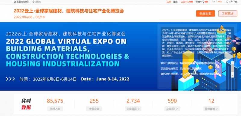 作为广东省“粤贸全球”系列展会之一的2022云上·全球家居建材、建筑科技与住宅产业化博览会,以打造“粤贸全球”品牌为己任,开展首日聚集255家家居建材、建筑科技与住宅企业,全球85517人次(数据统计截止至6.8下午17时)云上实时观展,集中展示智能家居、家居门窗、陶瓷、卫浴厨电、建筑材料、定制家居、家居配套服务等领域企业的尖端技术、热门产品、解决方案,全方位展示“粤企”实力,多角度体现“粤货”魅力。