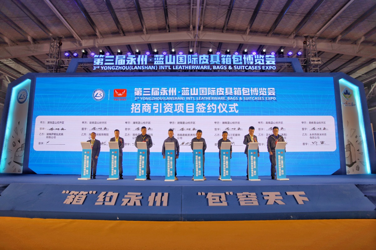 3月24日上午,第三届永州·蓝山国际皮具箱包博览会在湖南省永州市蓝山县皮具箱包科技产业园创品国际智慧物流园拉开帷幕。本届博览会以“‘箱’约永州、‘包’容天下”为主题,现场签约招商引资项目14个,总投资金额13亿元,现场签订外贸订单8单,签约金额3.5亿元人民币。