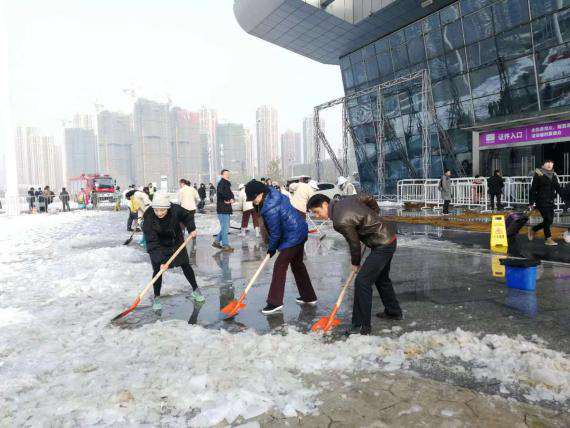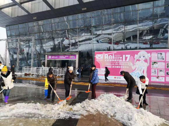 为了现场的人员安全,2018年12月31日清早,汉阳区会展和物流中心主任李明红、副主任牛海彤等领导带头在武汉国际博览中心开展了铲雪除冰活动,清除展馆B0登录厅外路面积雪,消除安全隐患。大家拿着准备好的铁锨、推车、大扫帚等工具,在零下的温度,冒着刺骨的寒风,干劲十足地挥动手中的铁锹和扫帚,一起凿冰、铲雪、扫雪,场面热火朝天。区会展办率先垂范,齐心协力,大家花了近一个半小时时间,清扫出展馆外各主要路段的积雪。通过铲积雪、铺草垫、排隐患、送温暖等举措,确保第十七届艾妮动漫游戏展开展期间秩序稳定,来现场参与活动的人员基本未受影响。