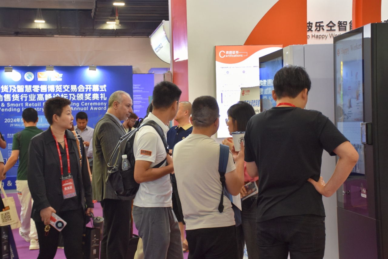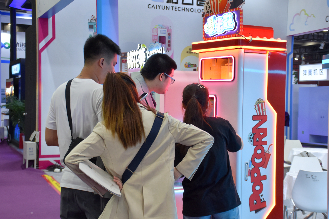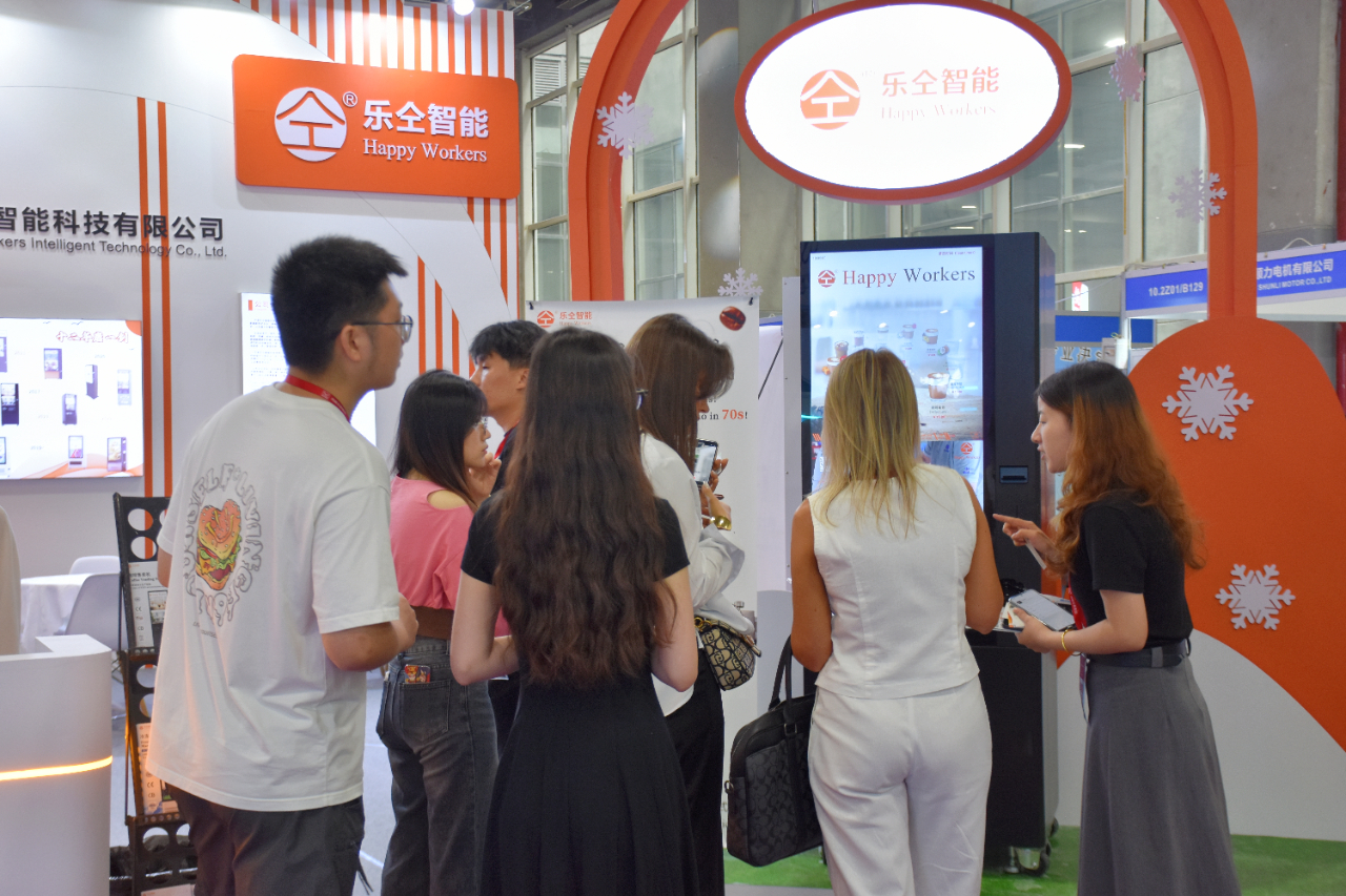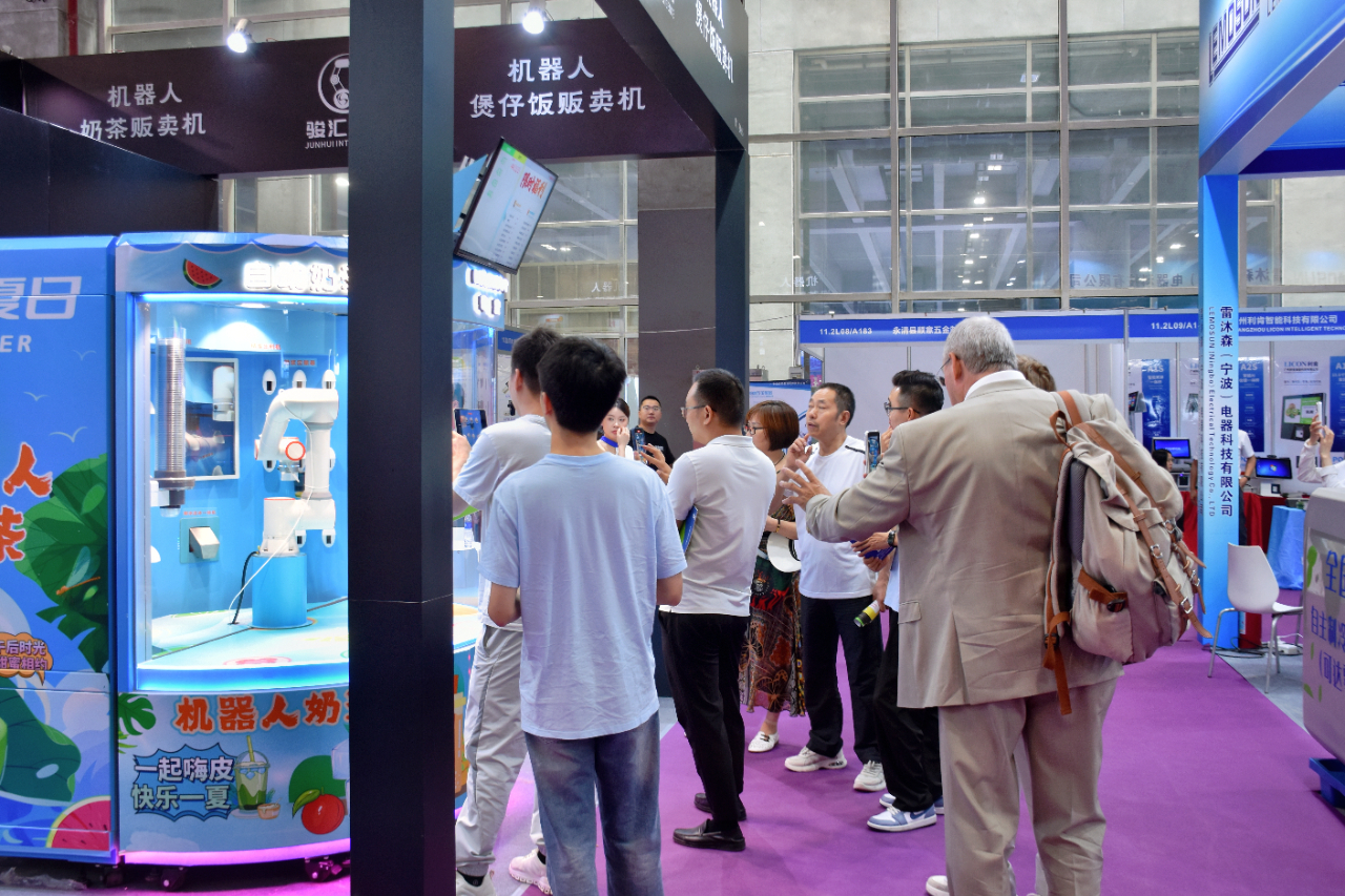 现场展示了自动制作咖啡、奶茶、爆米花、棉花糖、冰激凌、煲仔饭等餐饮产品的无人零售机器。